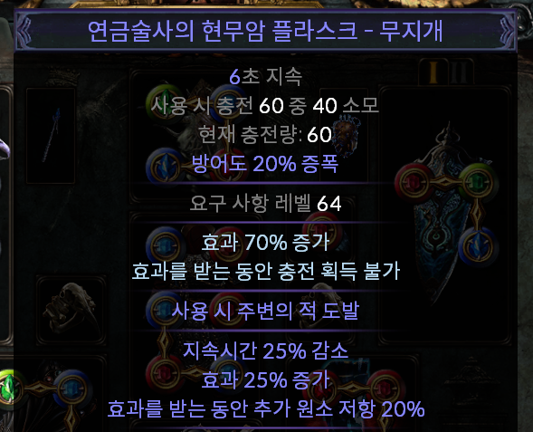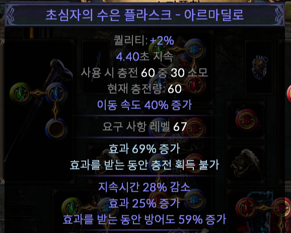 이렇게 화강암과 현무암 플라스크를 사용해 주고, 플라스크 효과를 받는 동안 방어도 증가 속성을 세팅하면서 자극의 오브로 플라스크의 효과를 증가시켜 주면 순식간에 방어도를 엄청나게 높일 수 있고, 생존을 보다 좋게 만들 수 있습니다.