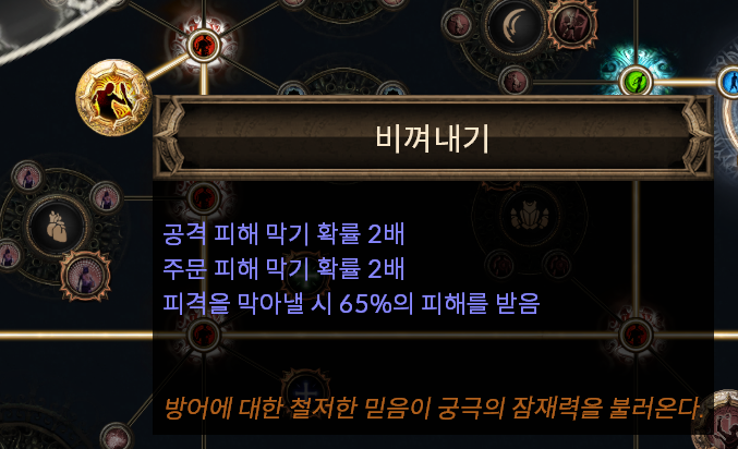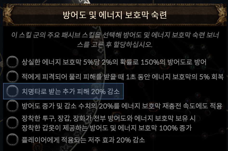 (상황에 따라서는 패시브 트리와 갑옷의 타락 고정 속성을 조합해서 치명타로 받는 추가 피해를 100% 감소시키는 것도 아주 좋은 방법입니다.)