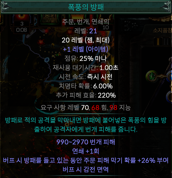 플라스크 접미어 속성으로 감전 긴급회피 수치를 최소 52%(효과 증가 95% 기준) 이상을 챙겨준다면 플라스크 효과를 받는 동안 약 100%의 확률로 감전 긴급회피를 세팅할 수 있기 때문에 폭풍연막 세팅을 플라스크 접미어 속성 하나로 해결이 가능합니다.