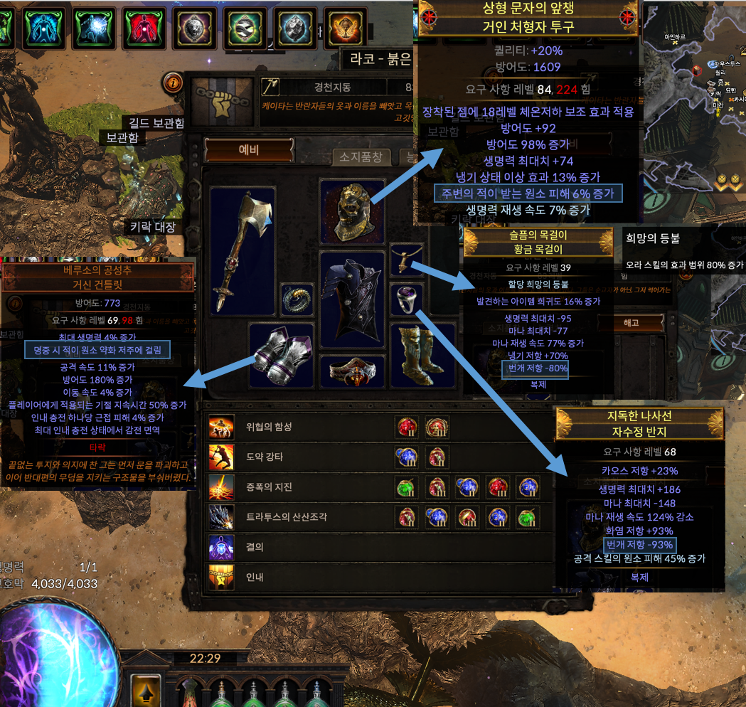 가격이 너무 비싸서 용병에게 "명중 시 원소 약화 저주에 걸림"이 타락된 힘 장갑을 착용시켜 주었습니다. 그리고 투구의 경우 쉐이퍼 영향력이 부여된 거인 처형자 투구를 구매해서 수확 푸르미 제작대로 주변의 적이 받는 원소 피해 6% 증가가 부여될 때까지 생명력 속성 부여 제작을 하였습니다.