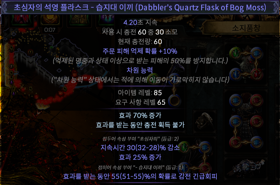 그리고 저주 효과 감소 또한, 플라스크 효과의 총합이 95%를 기준으로 최소 52% 이상을 세팅해 주면 저주 효과 감소는 100%가 되어 저주에는 걸리지만, 저주 효과는 없다시피 한 상황이 됩니다.