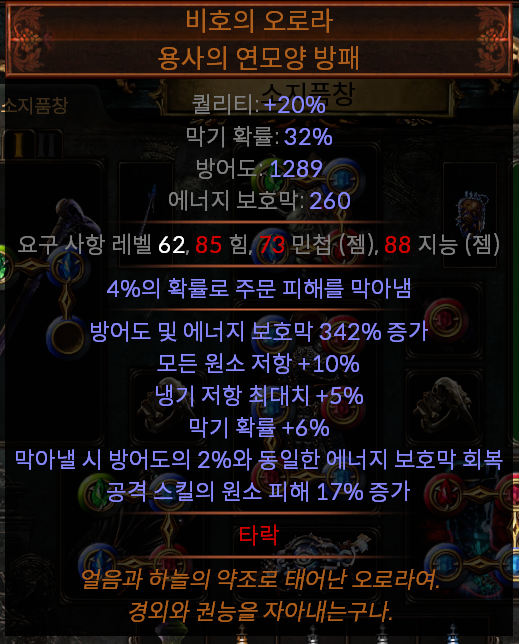 비껴내기를 활용하고 폭풍의 방패를 활용하고, 비전 수호 패시브까지 할당하게 되면 기본적인 주문 막기 확률의 최대치인 75%까지 3%가 부족합니다. 그래서 이렇게 타락 고정 속성으로 비호의 오로라에서 "4%의 확률로 주문 피해를 막아냄"을 챙겨주면 주문 막기 확률도 75%까지 세팅이 가능합니다.