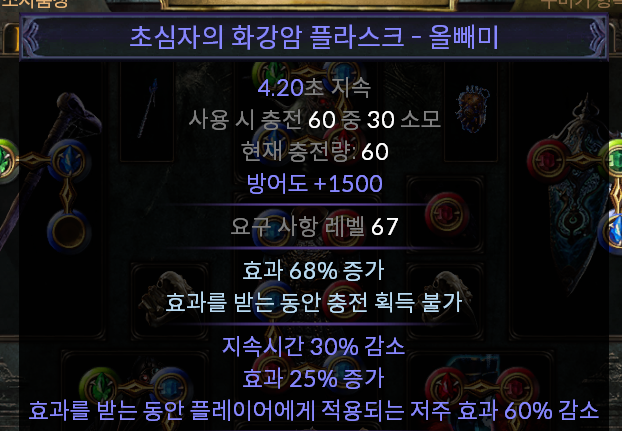 그래서 화강암 플라스크와 현무암 플라스크를 사용해 주었습니다. 그리고 4개의 플라스크 중 1개에서 효과를 받는 동안 방어도 증가 접미어를 1 티어로 세팅해 주었고요.
