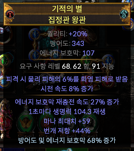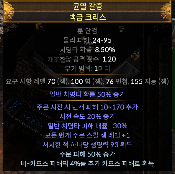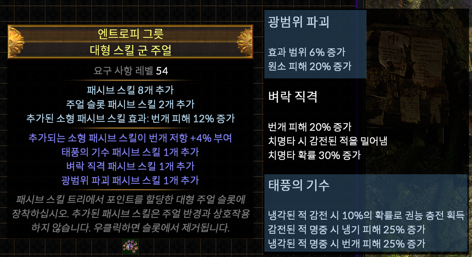 - 모든 물리 주문 스킬 젬 레벨 +1 또는 모든 번개 주문 스킬 젬 레벨+1(필수)