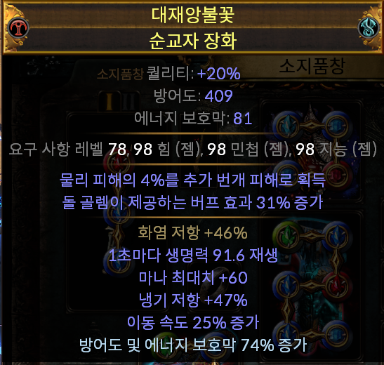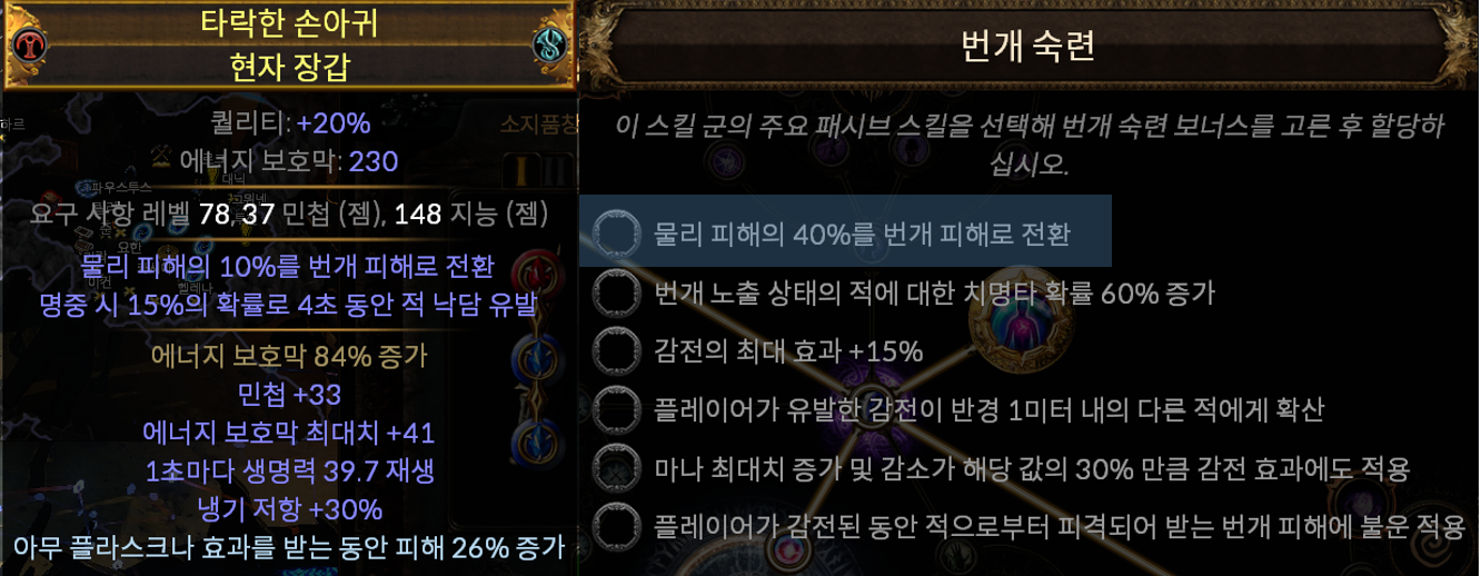 이번 리그에서는 용병의 번개 역저항 세팅으로 번개 피해 기반의 빌드가 엄청나게 강력한 모습을 보여주고 있습니다. 그러므로 번개 숙련과 장갑의 세계 포식자 고정 속성으로 물리 피해 n%를 번개 피해로 전환을 챙겨서 100% 번개 피해를 주도록 세팅해 주어야 합니다.
