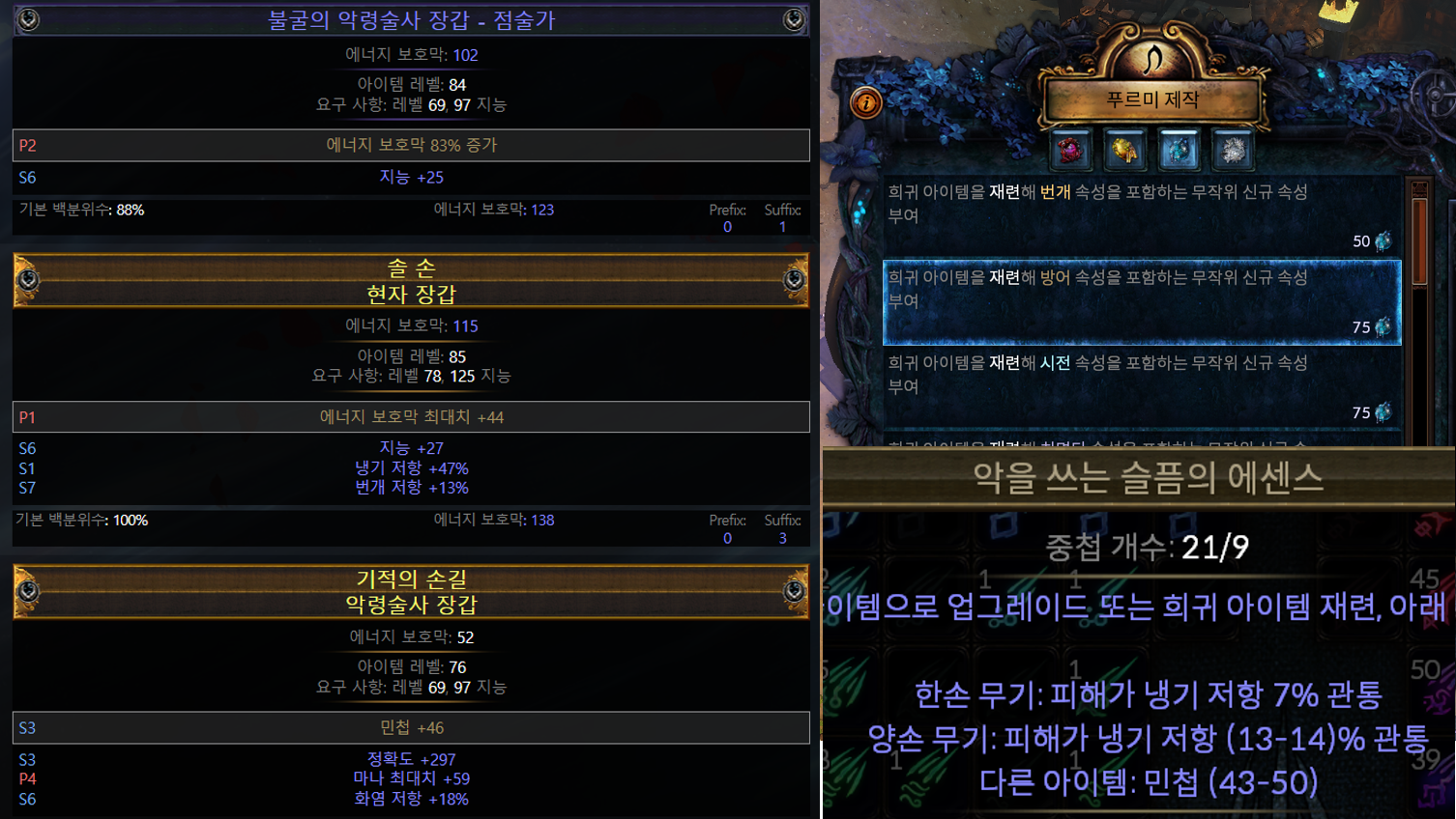기본적인 크래프팅을 연습하는 과정으로 에너지 보호막 관련 속성이나, 민첩이 분열된 베이스 장갑을 거래소에서 구매해서, 수확 푸르미 제작대의 방어 속성 재련이나 슬픔의 에센스를 사용하는 에센스 크래프팅을 직접 도전해 보는 것도 좋은 경험이라고 생각합니다.