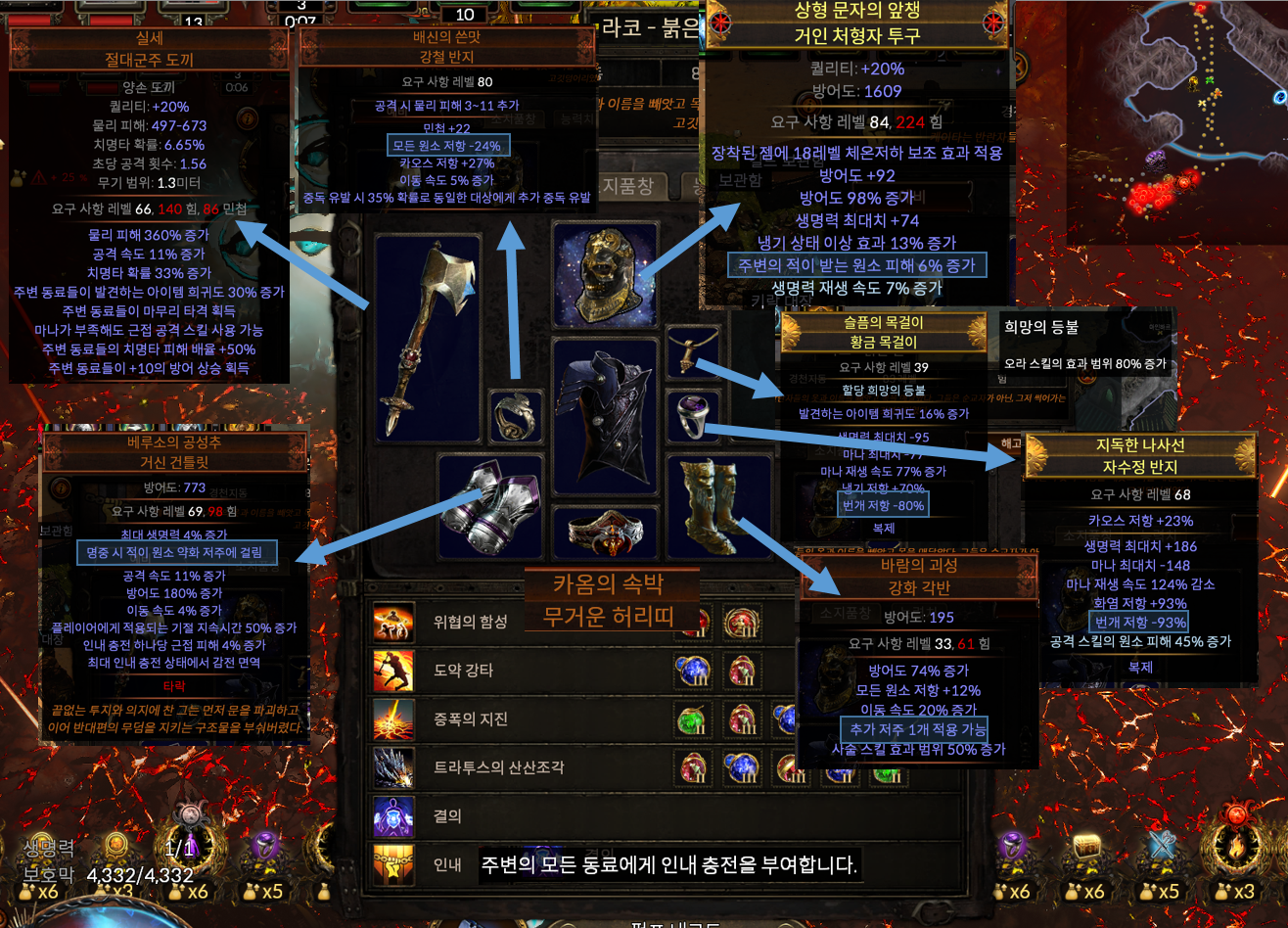 리그가 꽤 진행된 시점이다 보니, 마냥 저자본 세팅은 아닙니다. 일단 마법사의 피를 들고 시작했으니까요. 마법사의 피가 없다면 이번 리그 정말 저렴한 헤드헌터를 이용해서 빌드업하셔도 좋습니다. 다만 이 부분까지 가이드에 담지 못한 점은 너그러이 양해부탁드립니다.