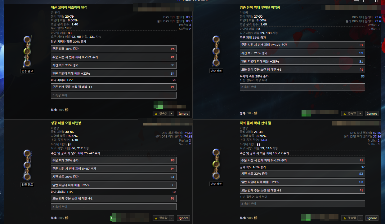 이러한 조건을 토대로 거래소에서 검색을 하면 100c 언저리로 충분히 좋은 성능을 보여주는 가성비 무기를 구할 수 있습니다.