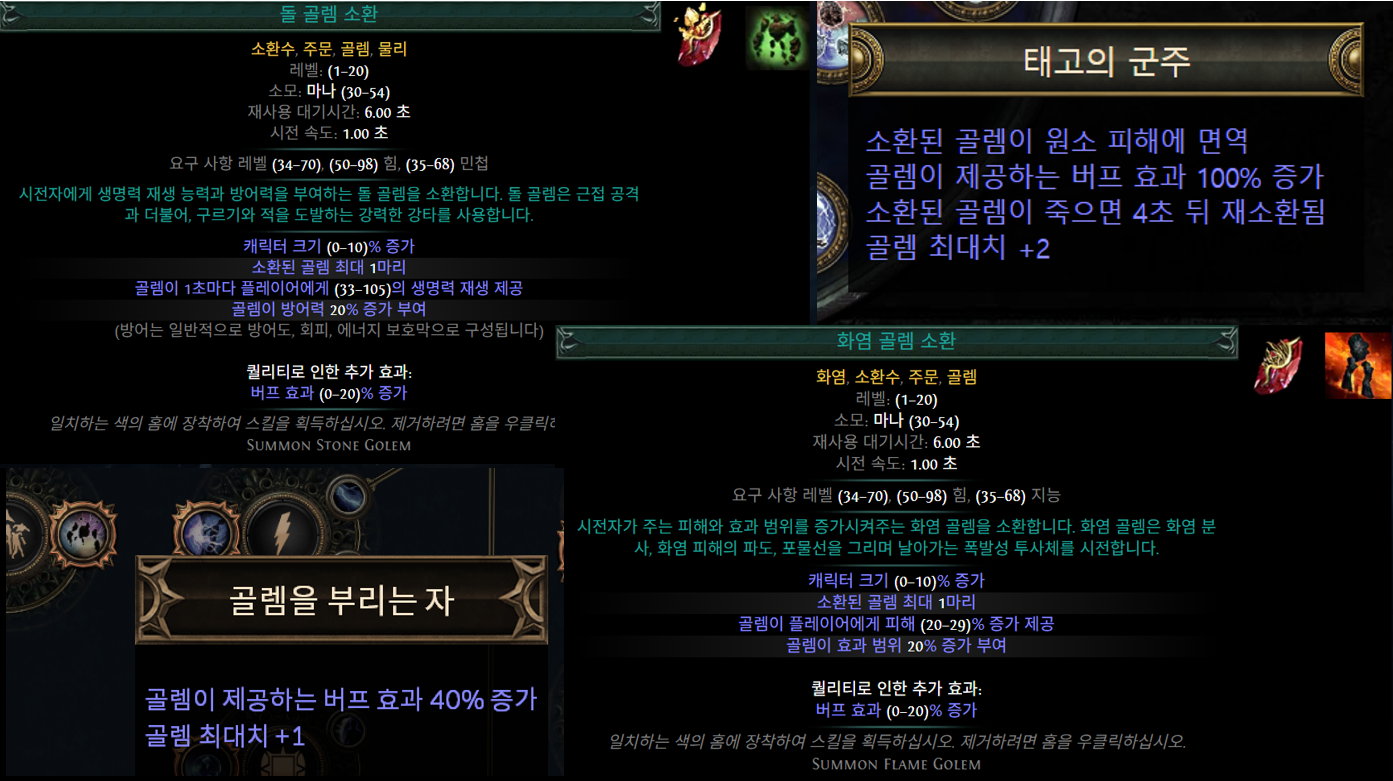 기본적으로 소실 속낙 스킬의 답답한 클리어링을 '시폭'이라고도 줄여 말하는 시체 폭발 효과를 꼭 활용해줘야 하고요. 이 시폭 효과를 극대화하기 위해서는 효과 범위를 많이 증가시켜줘야 합니다. 이번에 골렘이 제공하는 버프는 아주 좋게 변경되었는데요. 엘리멘탈리스트의 태고의 군주 패시브와 함께 조합되면 화염 골렘으로 효과 범위를 아주 손쉽게 증가시킬 수 있습니다. 여기에 돌 골렘의 버프로 생존도 쉽게 높여나갈 수 있고요!