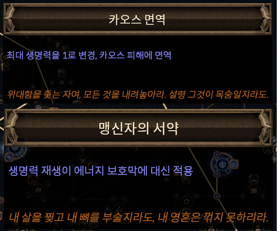 - 피격 시 물리 피해의 n%를 카오스 피해로 받음(세계 포식자, CI 세팅이 아니라면 화염)