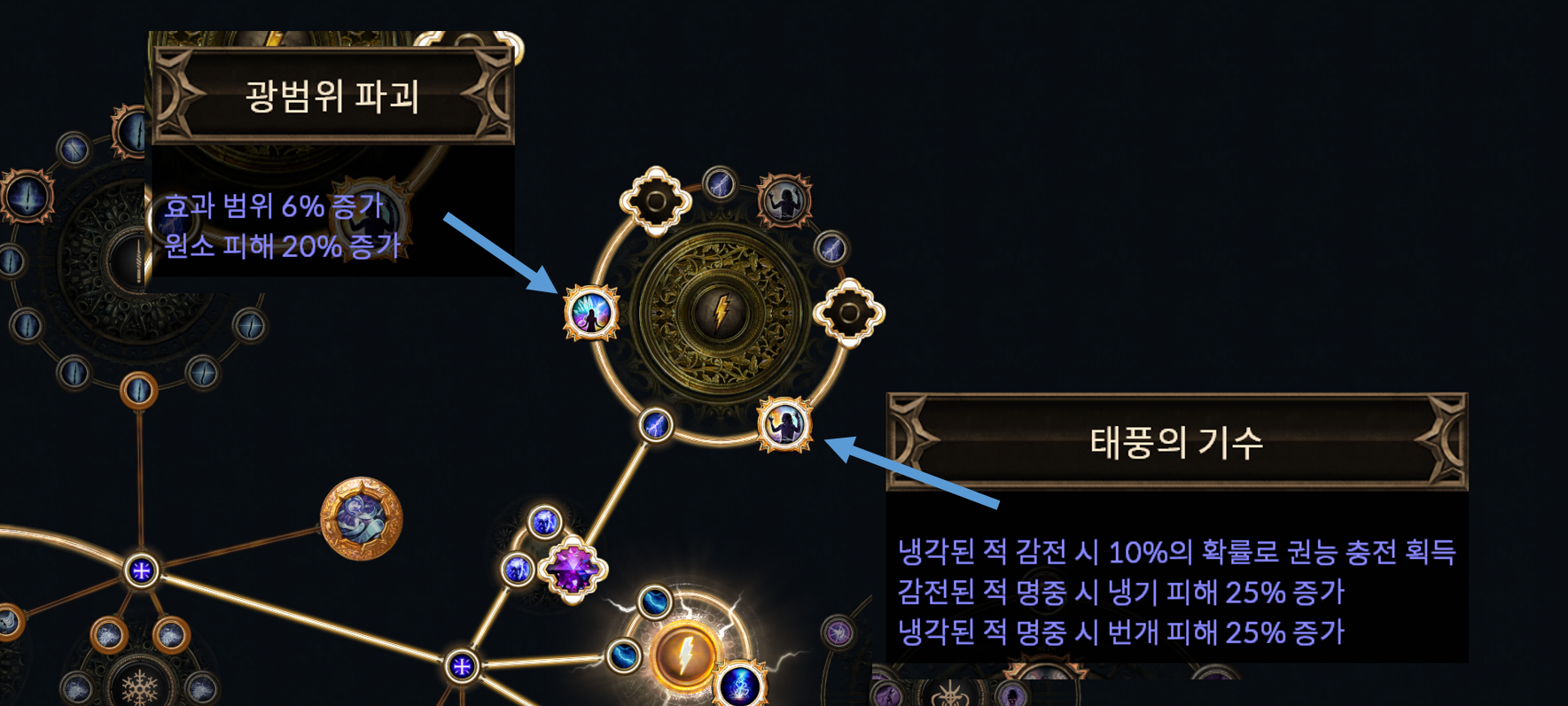 꼭 위아래에 배치된 것을 구매해 주셔야 하고, 가운데에 광범위 파괴나 태풍의 기수가 있는 것을 구매하시면 안 됩니다. 잘못 구매하시면 패시브 노드 낭비가 발생합니다. 물론, 주요 패시브 3개를 다 쓴다면 위치는 상관없어요!