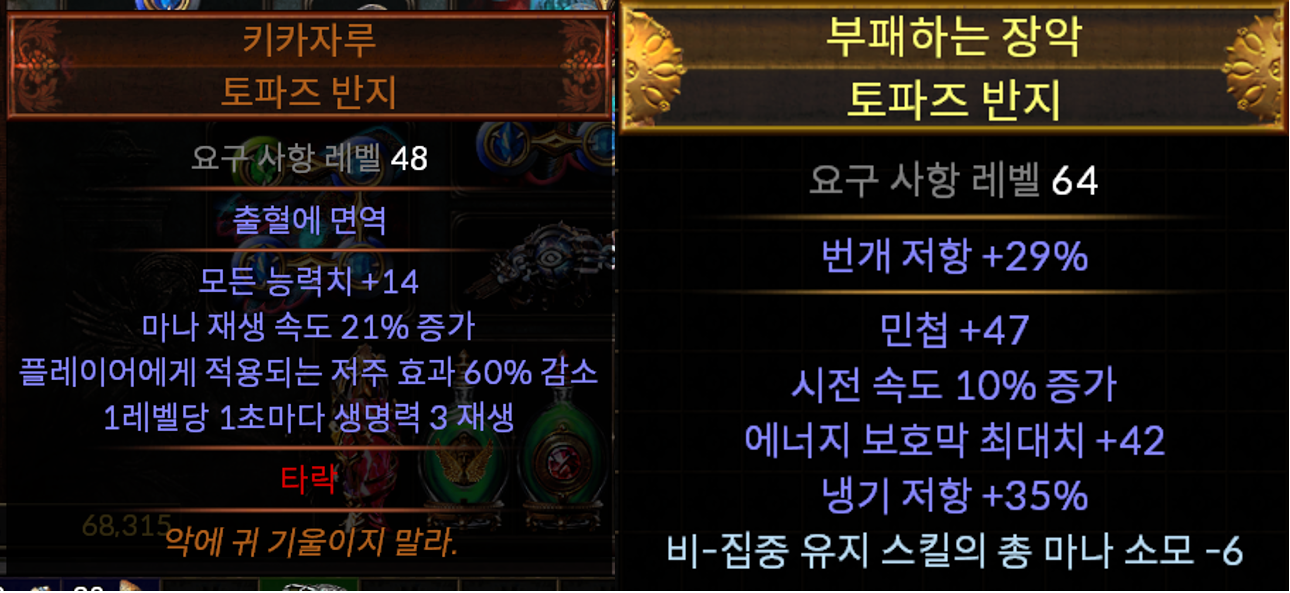 다음으로 반지는 시전 속도, 에너지 보호막 최대치, 부족한 능력치나 원소 저항에 맞춰 구매하시면 되는데요.